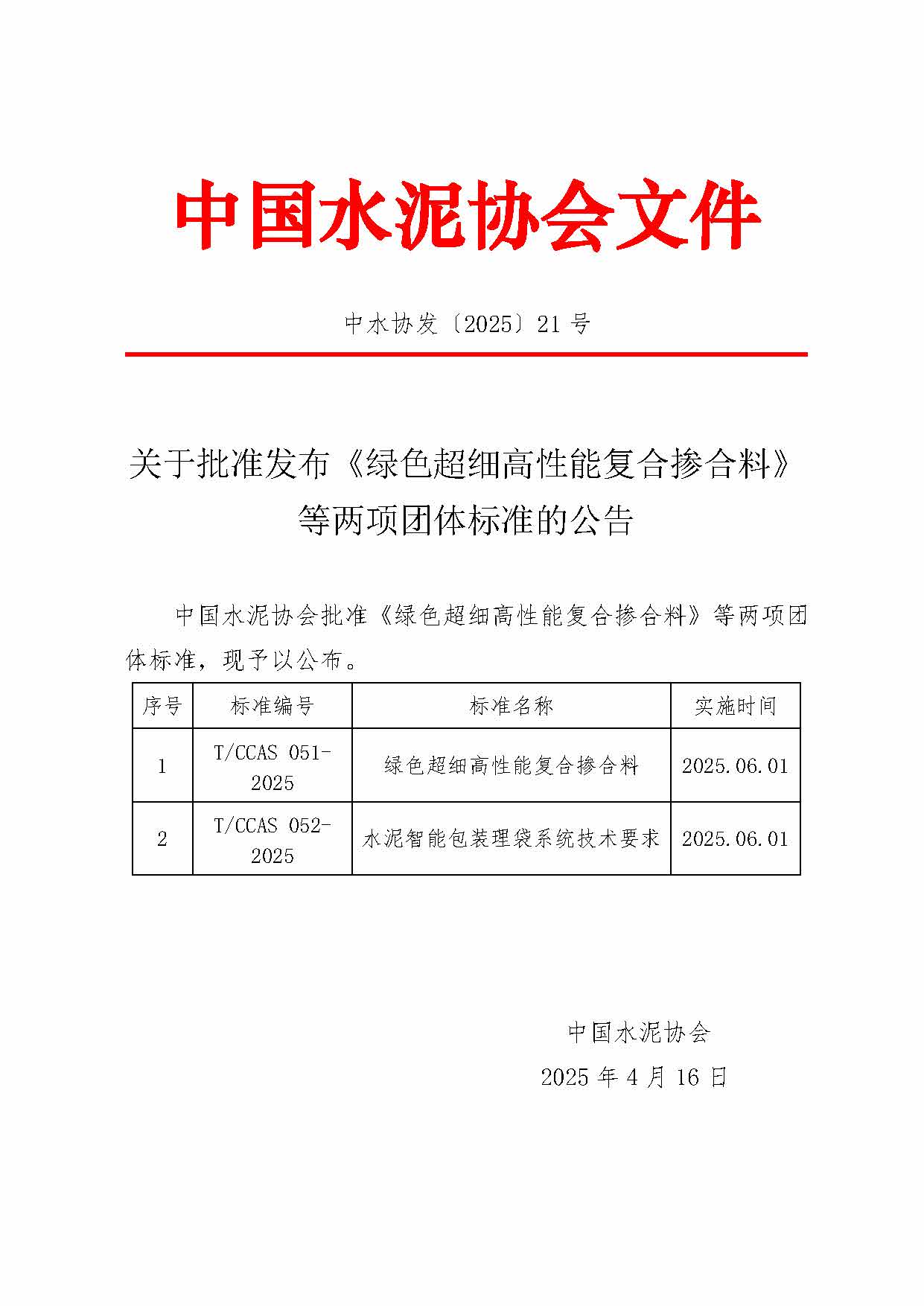 關(guān)于批準(zhǔn)發(fā)布《綠色超細(xì)高性能復(fù)合摻合料》 等兩項團(tuán)體標(biāo)準(zhǔn)的公告