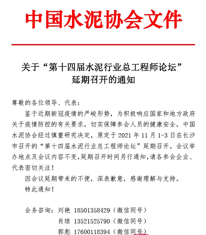 關于“第十四屆水泥行業總工程師論壇”延期召開的通知