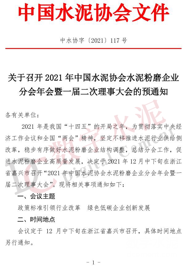 關(guān)于召開2021年中國水泥協(xié)會水泥粉磨企業(yè)分會年會暨一屆二次理事大會的預(yù)通知