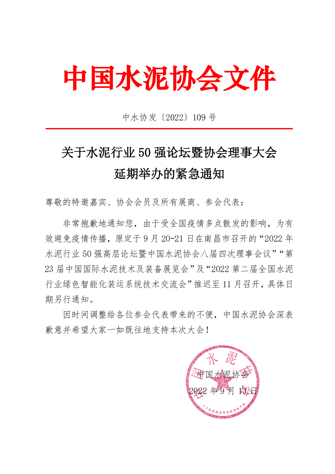 關(guān)于召開2022年水泥行業(yè)50強(qiáng)高層論壇暨理事大會延期舉辦的通知