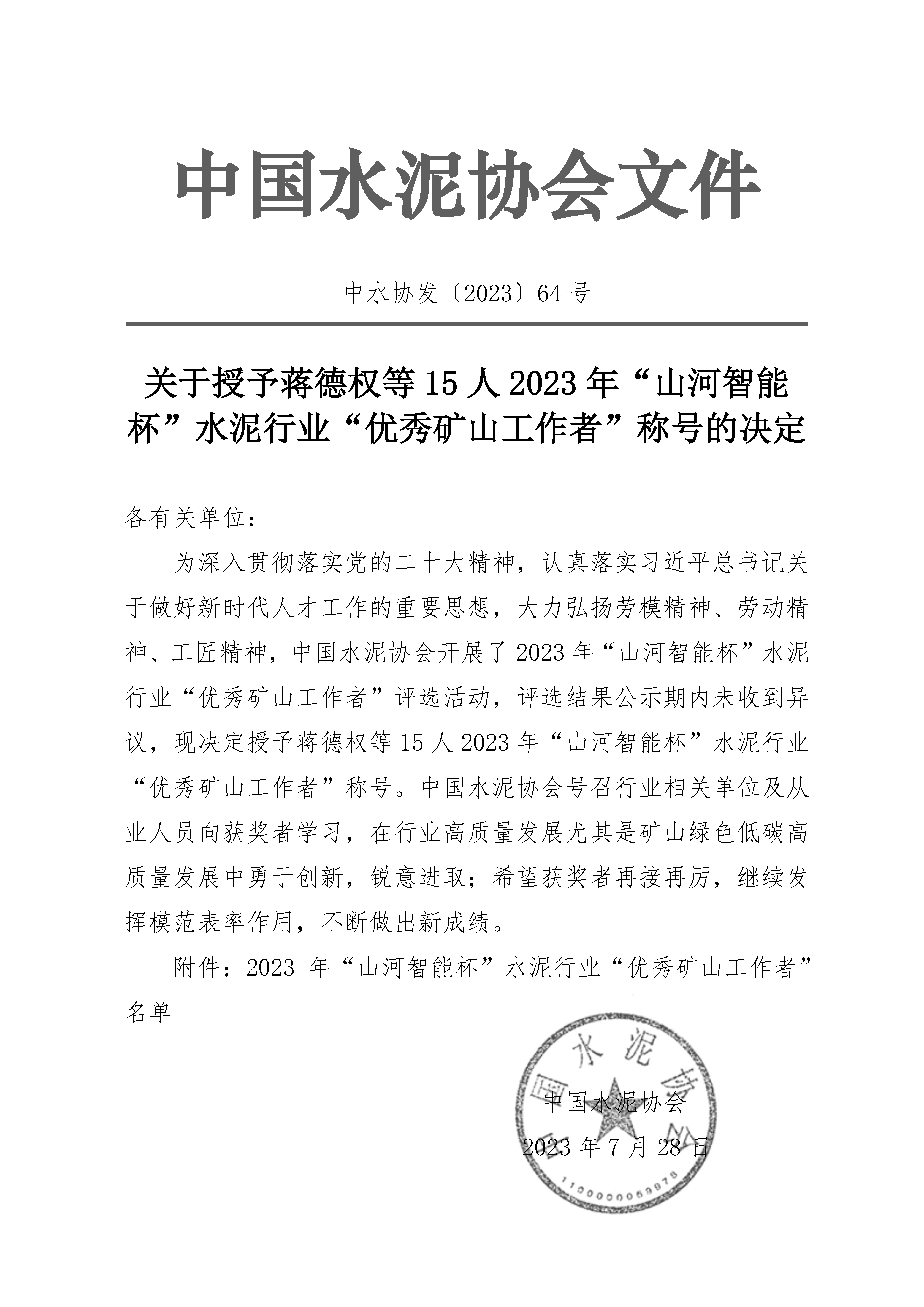 關于授予蔣德權等15人2023 年“山河智能 杯”水泥行業“優秀礦山工作者”稱號的決定