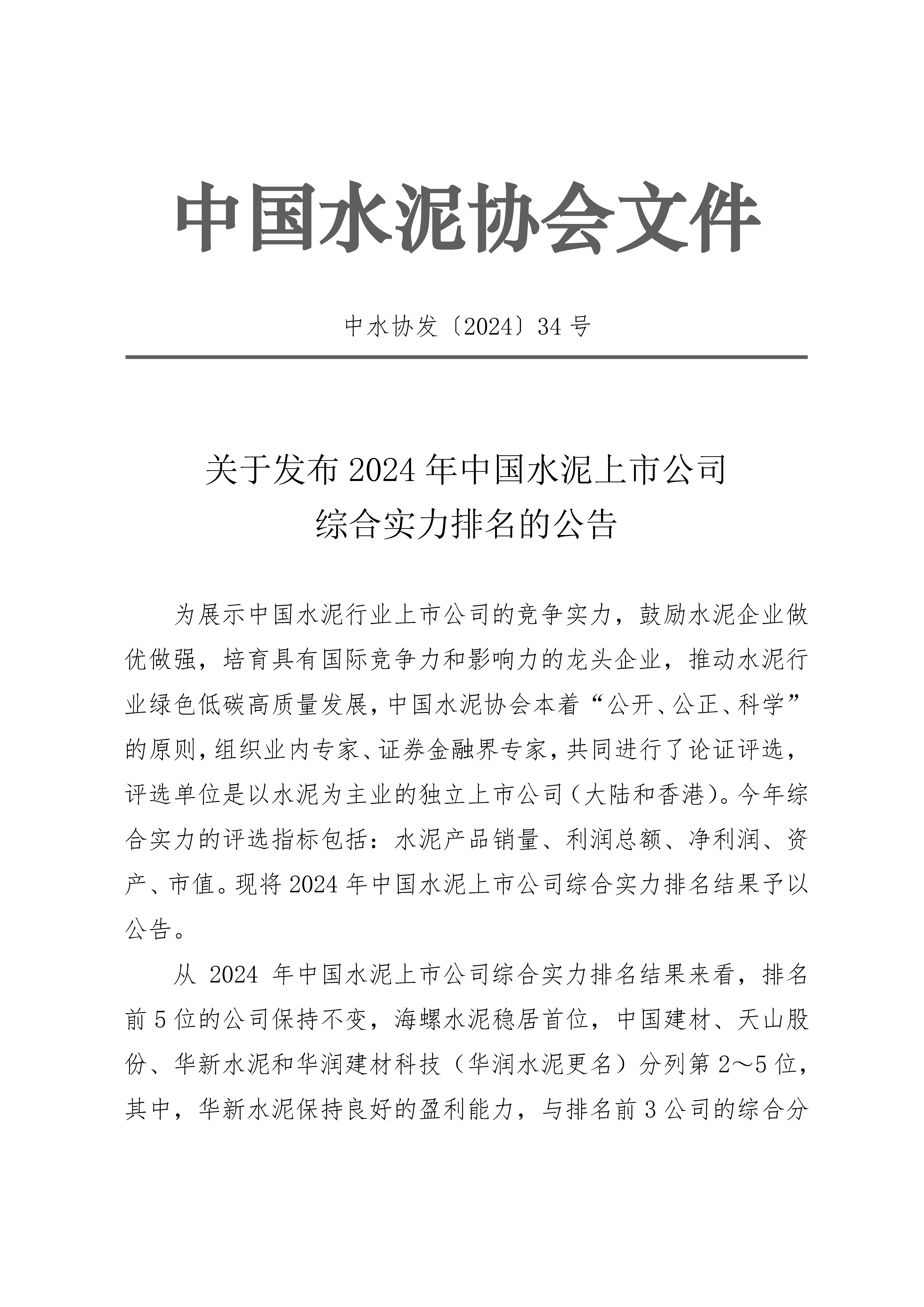 關(guān)于發(fā)布2024年中國(guó)水泥上市公司綜合實(shí)力排名的公告